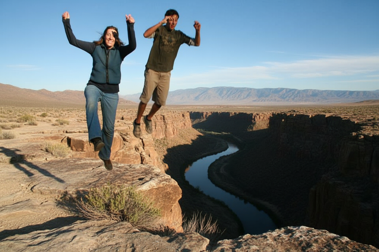 Can you take the uploaded photo and change the background to make it look like the people are jumping from a cliff
