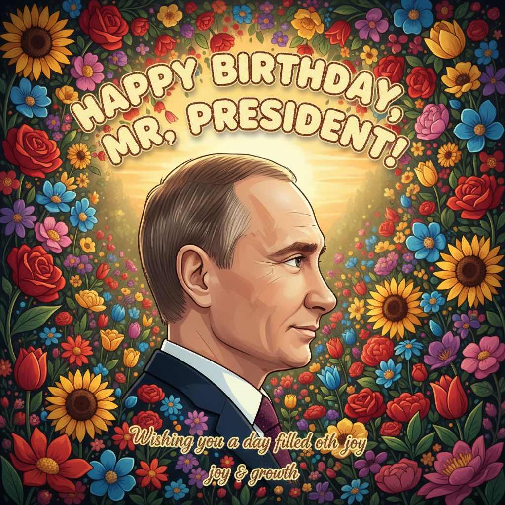 A happy birthay même for President Putin with his profile standing in a garden of colour