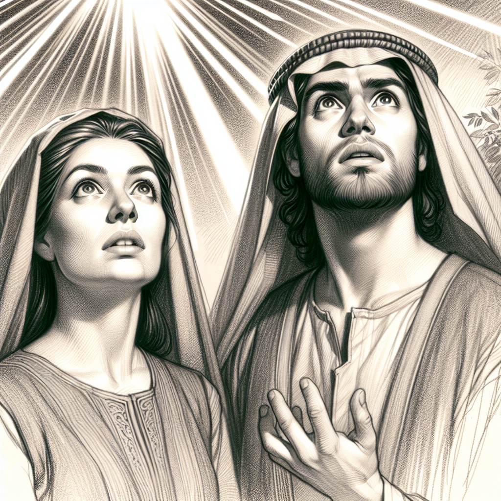 pencil sketch a woman and man with expressions of awe, who lived during the time of Jesus and saw beams of light in the sky