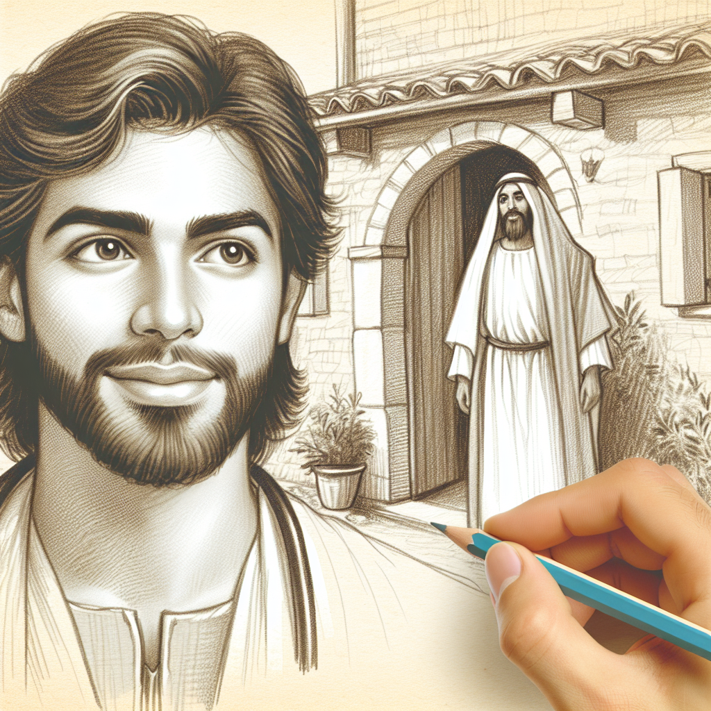 pencil sketch a doctor who is a man with expressions of awe, who lived during the time of Jesus and was asked to care for Mary but as he approached the house, a man was standing at the doorway with clothes that were blindingly white