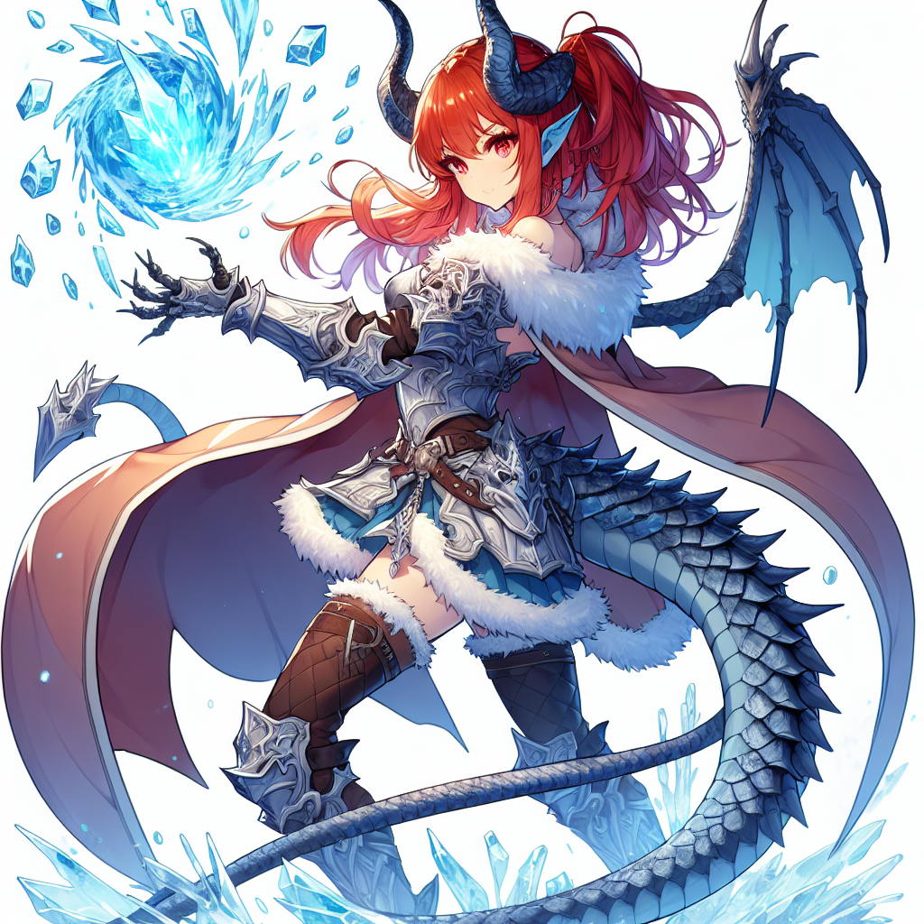 A female anime warrior in heavy plate with a demons tail. She has red hair and is casting a ice spell  - DrawGPT