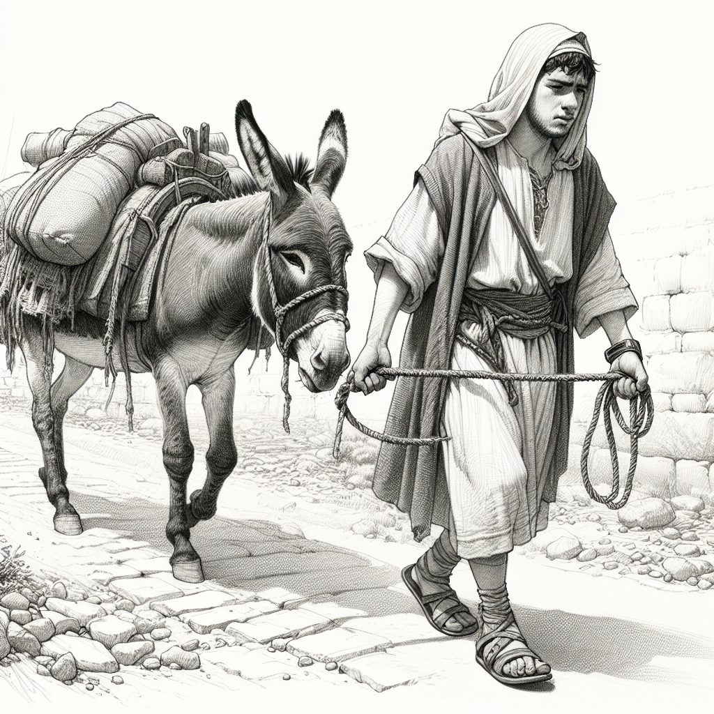 pencil sketch of a young middle eastern man who lived during the time of Jesus pulling a donkey
