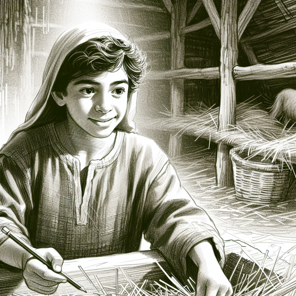 pencil sketch of an 11-year-old middle eastern girl with an expression of joy who lived during the time of Jesus and is helping in a stable helping to pile hay in a manger - DrawGPT