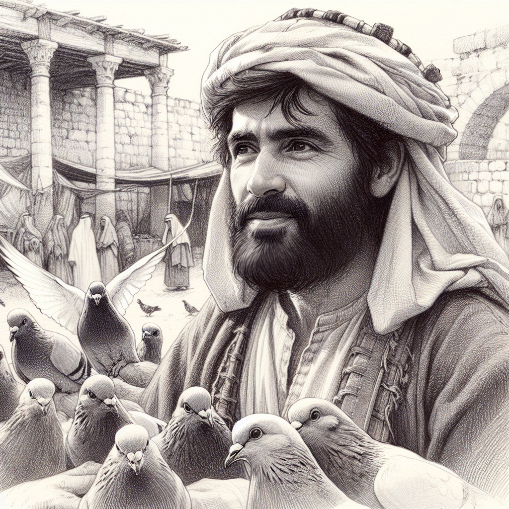 create a pencil sketch of middle eastern man with an expression of interest who lived during the time of Jesus and selling pigeons and doves near the temple
