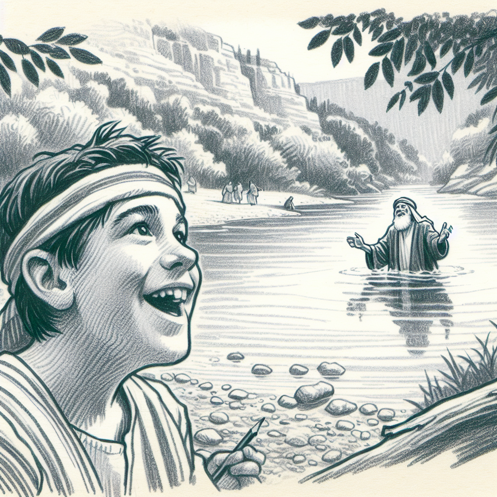 create a pencil sketch of a middle eastern 10-year-old boy who lived during the time of Jesus and was playing in the Jordan River when he spotted John the Baptist in the river - DrawGPT