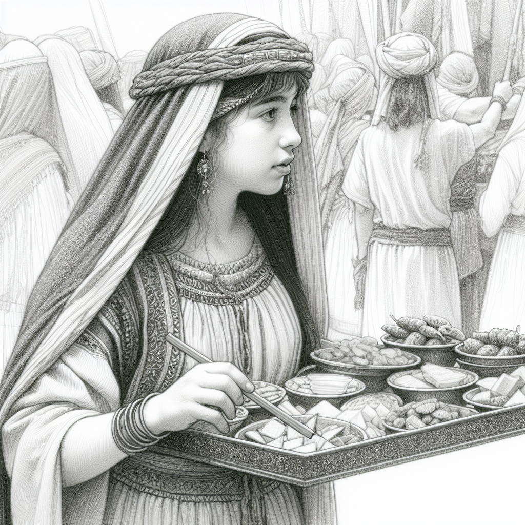 create a pencil sketch of a middle eastern 14-year-old girl who lived during the time of Jesus and was helping to serve food at a wedding feast