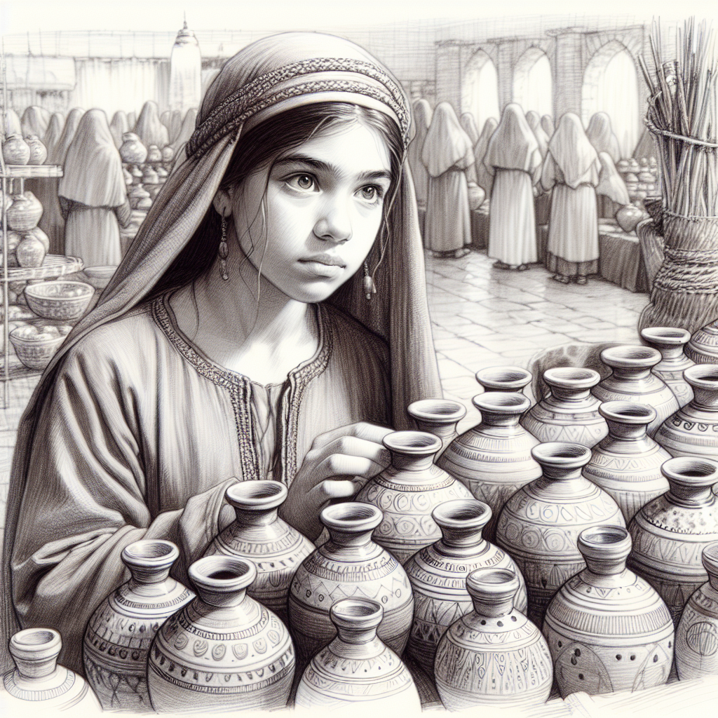 create a pencil sketch of a middle eastern 14-year-old girl who lived during the time of Jesus and was looking at water jars at a wedding feast