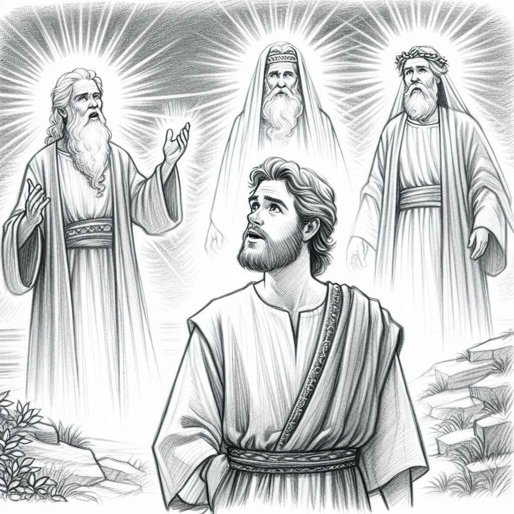 create a pencil sketch of a middle eastern apostle of Jesus named Andrew who lived during the time of Jesus and is witnessing three blazing bodies of Jesus, Moses and Elijah on the hill - DrawGPT