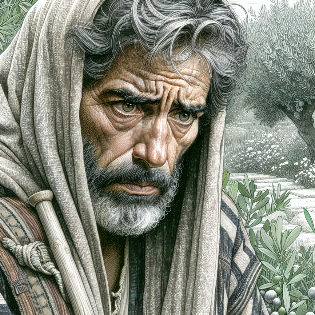 create a pencil sketch of a middle eastern older man who lived during the time of Jesus and anxious and worried in a garden