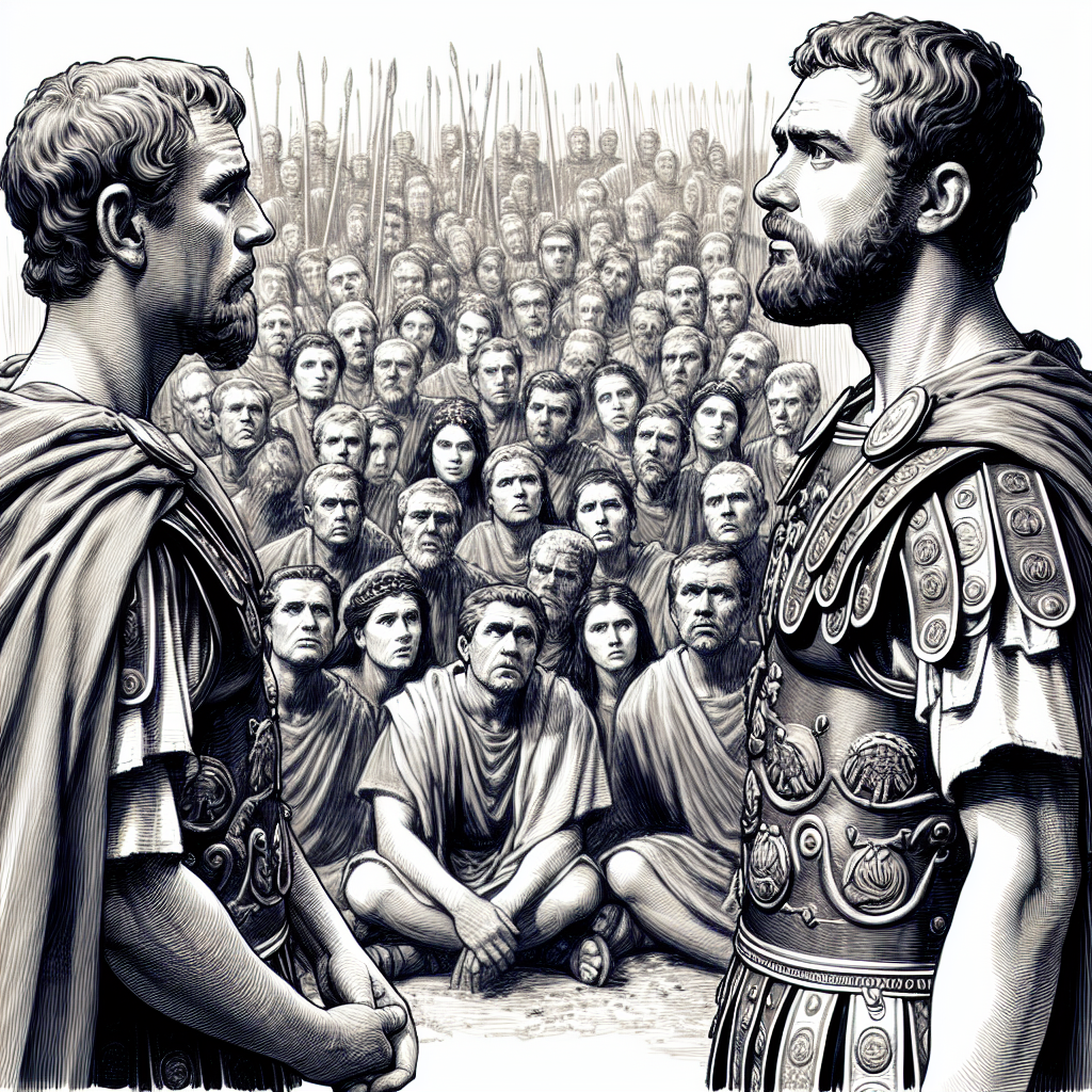 create a black and white pencil sketch of a roman soldier who lived during the time of Jesus and is watching in disbelief a crowd of people as they listen to Pontius Pilate - DrawGPT