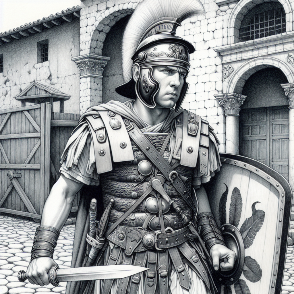 create a black and white pencil sketch of a roman soldier who lived during the time of Jesus and is walking into a courtyard with a concerned expression - DrawGPT