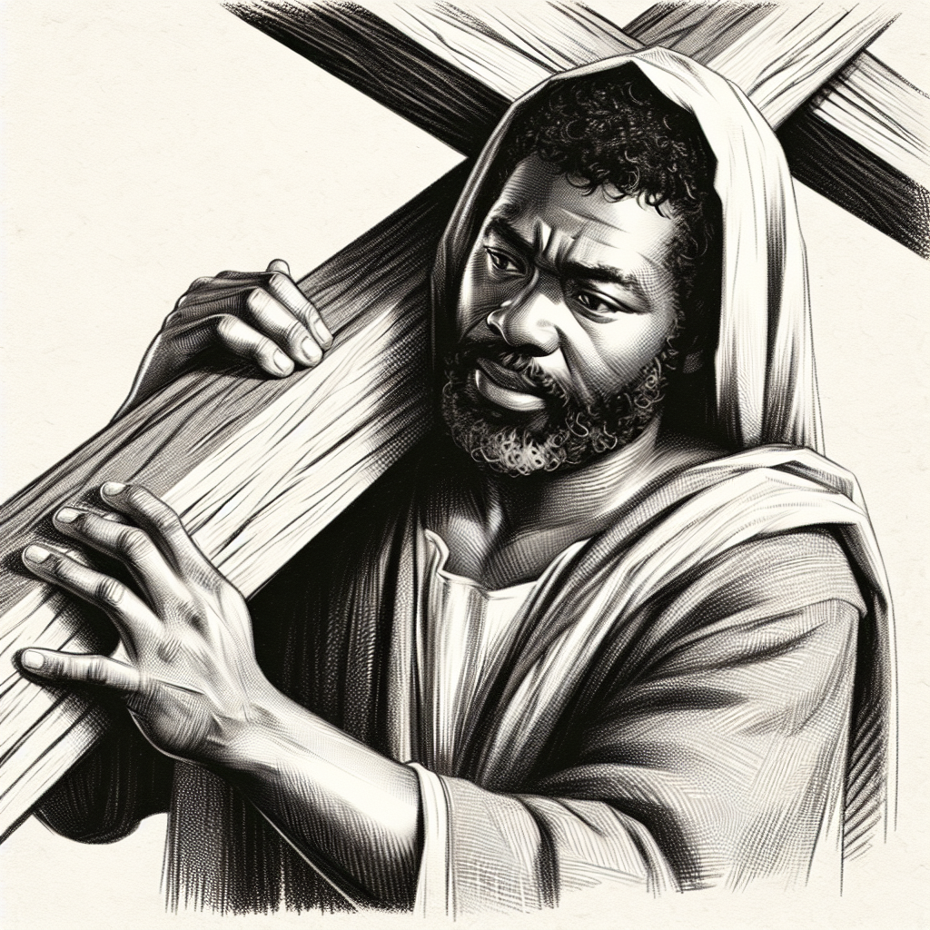 create a black and white pencil sketch of an African man who lived during the time of Jesus and is helping to carry the cross