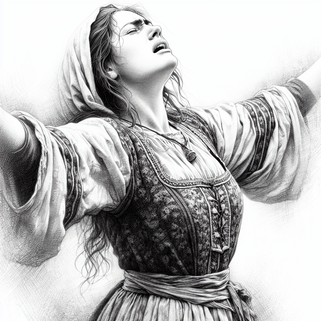 create a black and white pencil sketch of a Jewish woman who lived during the time of Jesus and is lifting her arms to the sky crying and being joyful at the same time - DrawGPT