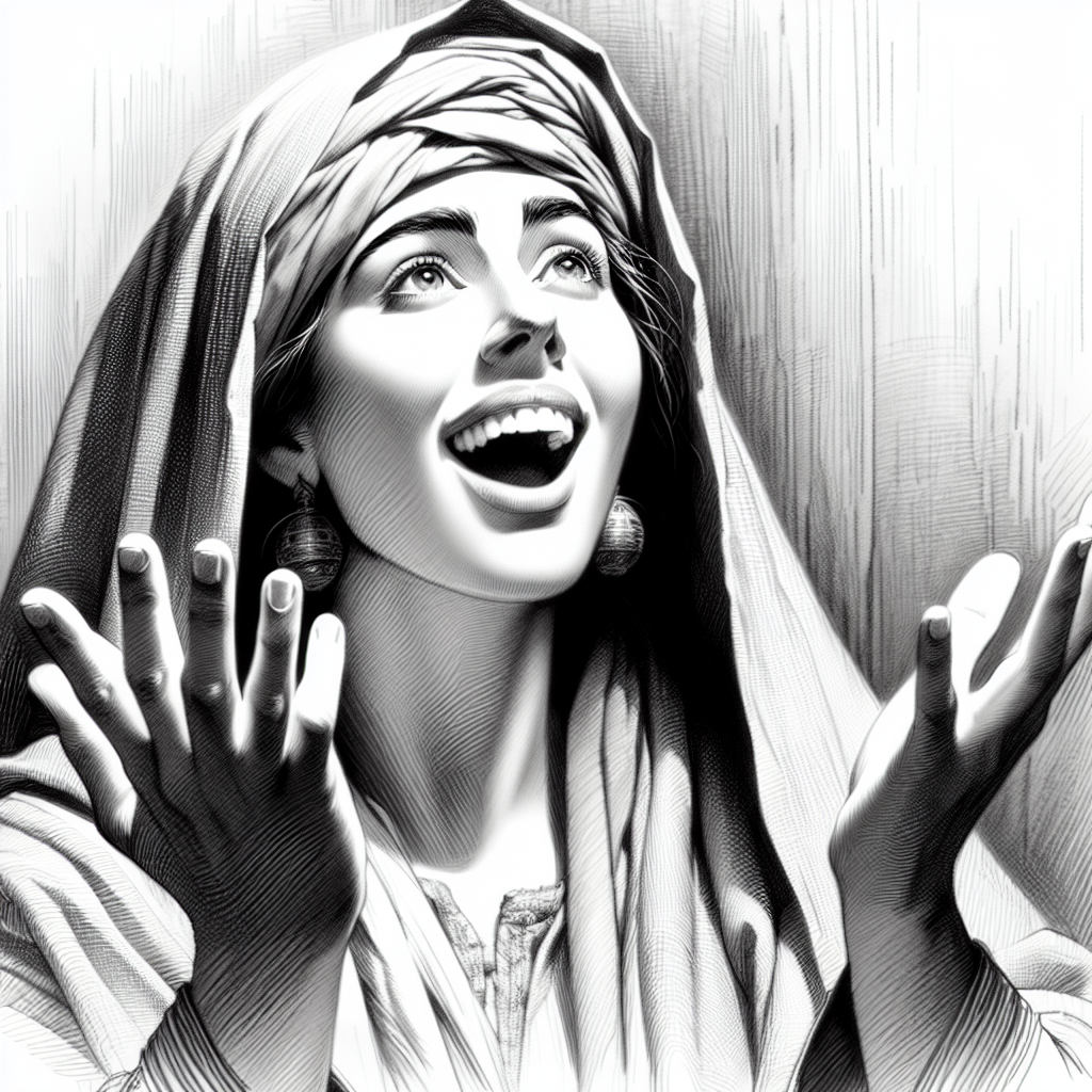 create a black and white pencil sketch of a aristocratic middle eastern woman who lived during the time of Jesus and joyful and amazed at Christ's resurrection