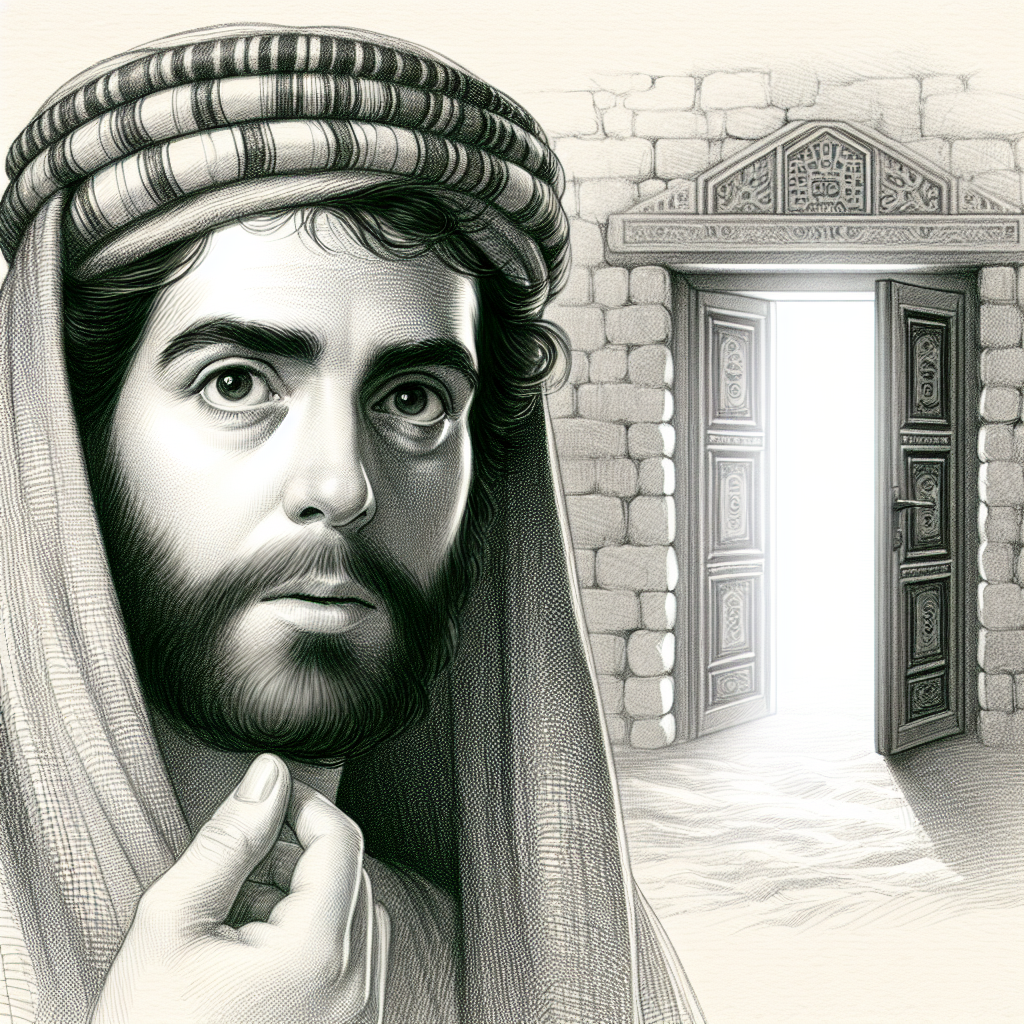 pencil sketch a doctor of middle eastern descent and rounded face who lived during the time of Jesus and has an expression of concern and is approaching a house where the doorway is full of light - DrawGPT