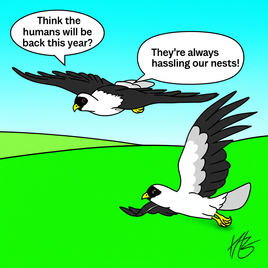 Cartoon image of two Mississippi kites flying the same direction, over a green prairie. One kite has a speech bubble saying "Think the humans will be back this year?" The other kite has a speech bubble saying "They're always hassling our nests!" - DrawGPT