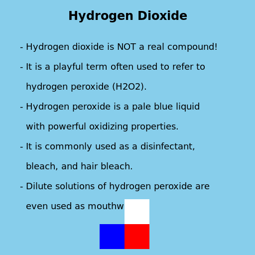 // Fun Comment: "Hydrogen Dioxide, the imaginary compound that cleans your teeth and colors your world!"