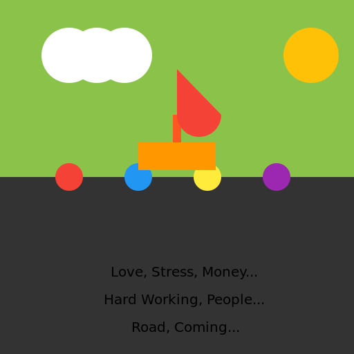 // The journey of life: Love, stress, money, road, people, coming, hard working.