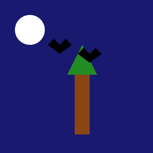 // Title: Nighttime Tree with Birds and Moon