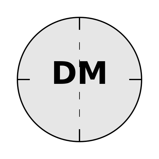 // Compass drawing with "DM" in the middle, black lines at the four points, and small black lines between them