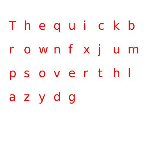 // I will use the sentence "The quick brown fox jumps over the lazy dog" and highlight each letter of the alphabet in red using a unique letter.
