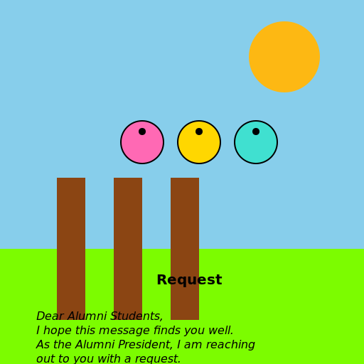 // "No alumni gathering is complete without happy faces and trees wearing festive colors! Let's make this event unforgettable!"