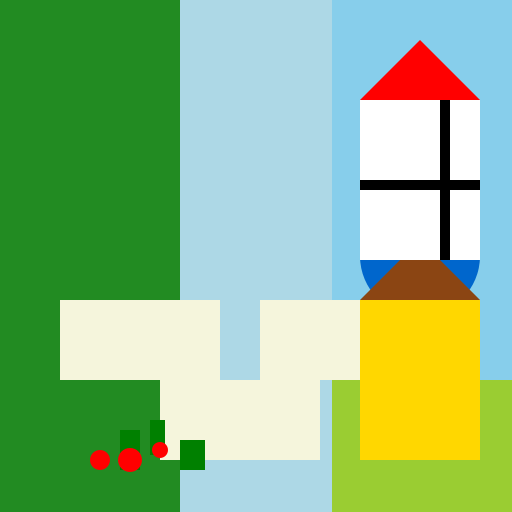 // Fun comment: "This charming countryside town has everything you need, from a peaceful park and lush greenery to a school and a church. Don't forget to pick some fresh veggies and fruits from the garden!"