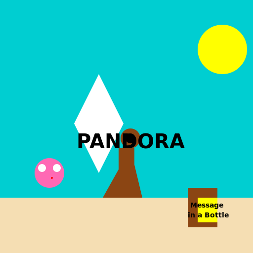 // We have a palm tree, a coconut, and a funny fish swimming by. Oh, and don't forget the message in a bottle!