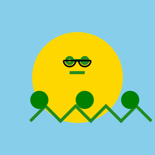 // "Sun behind tree branches, with a cool sunglasses-wearing face on the sun!"