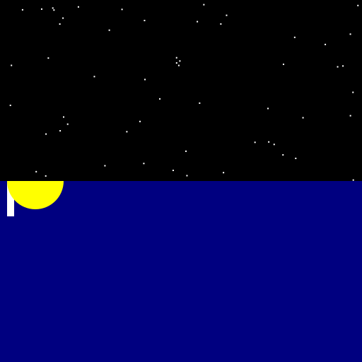 // A peaceful night with stars, ocean, a guiding beacon, and a playful half moon.