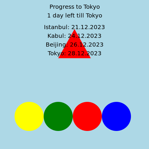 // Progress to Tokyo: 1 day left till Tokyo and the plane is in Beijing with reminders "Istanbul: 21.12.2023, Kabul: 24.12.2023, Beijing 26.12.2023 and Tokyo 28.12.2023"