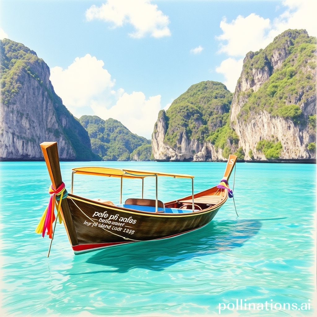 Color pencil drawing of a Thai fishing boat at Phi Phi Island, turquoise sea, limestone cliffs, traditional longtail boat, sunny tropical scenery