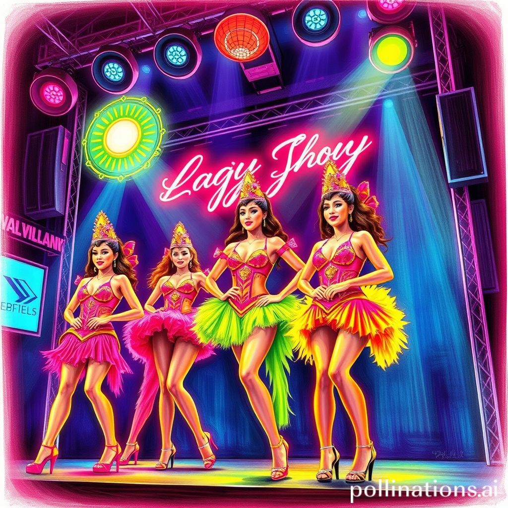 Neon drawing of a ladyboy show in Thailand, glamorous costumes, bright lights, stage performance, nightlife, colorful, cabaret style