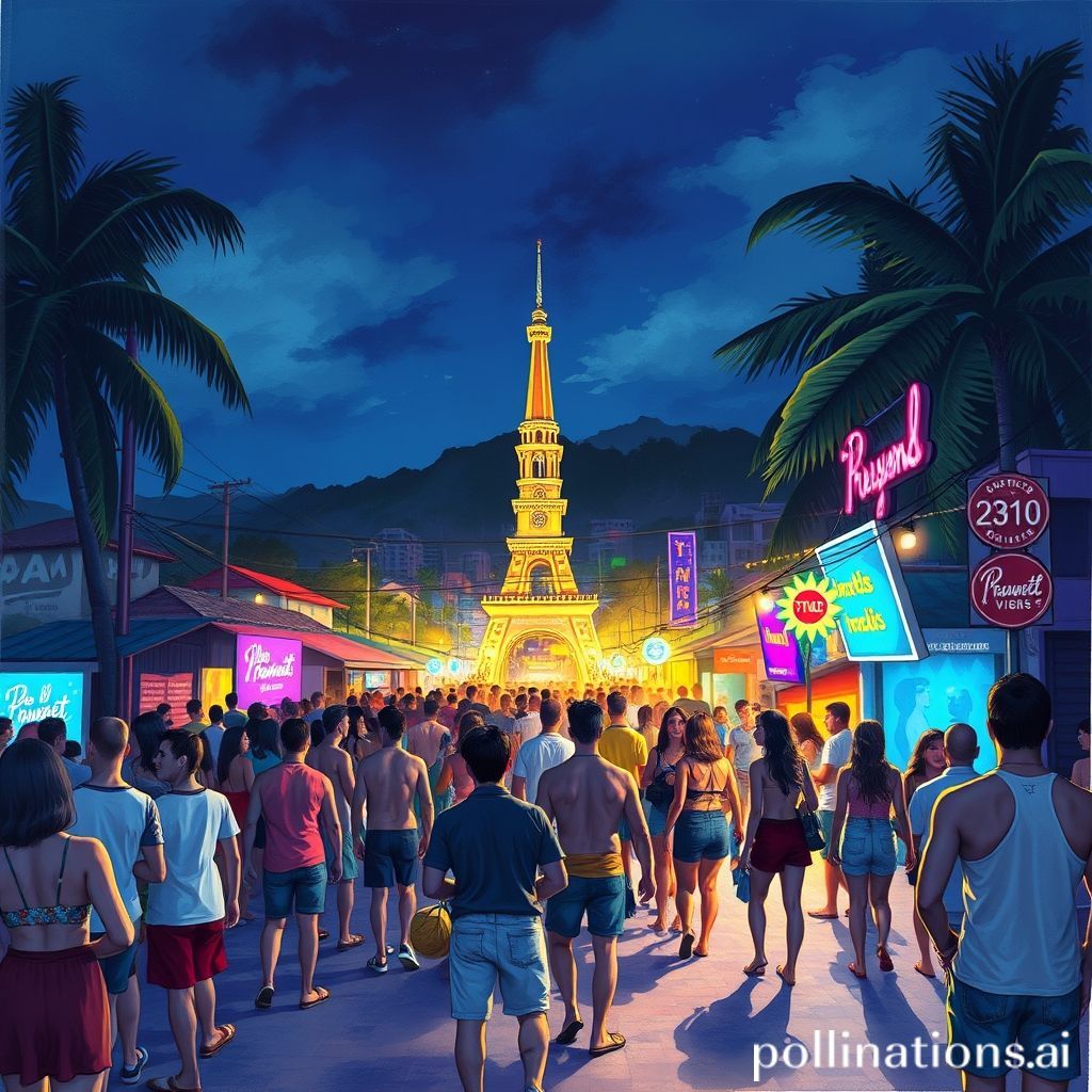 Realistic drawing of Phuket nightlife, street lights, people partying, night clubs, colorful lights, island vibes, Thailand at night