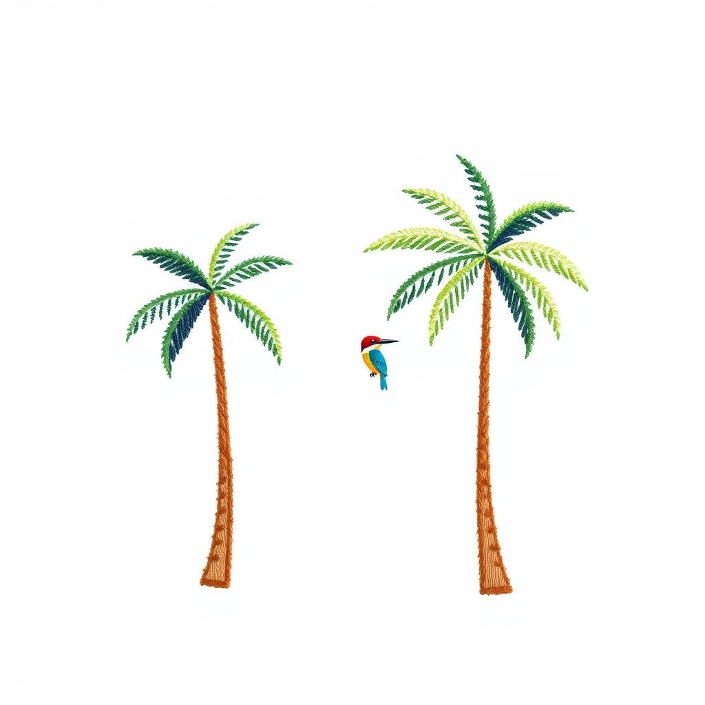 Create a clean embroidery-style design with grouped coconut trees and a small kingfisher sitting underneath. Use thread-like lines and keep it simple and elegant for use on clothing.