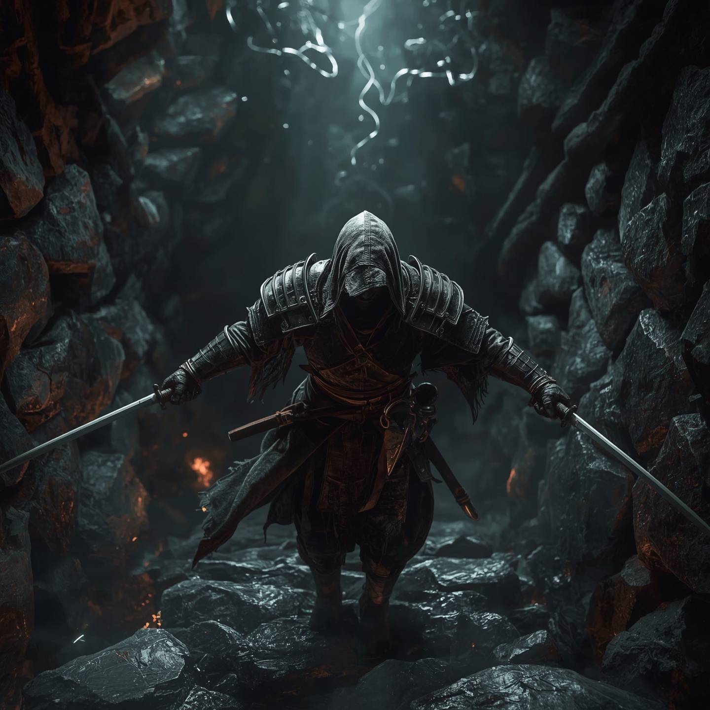 Create a highly detailed dark fantasy image featuring a powerful warrior with katanas descending into a shadowy abyss. Emphasize glowing shadows, eerie atmosphere, and a cinematic tone.