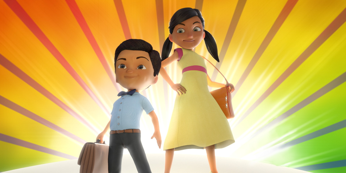 Anime-style drawing of two characters in confident poses, standing on a white platform with colorful radial background.