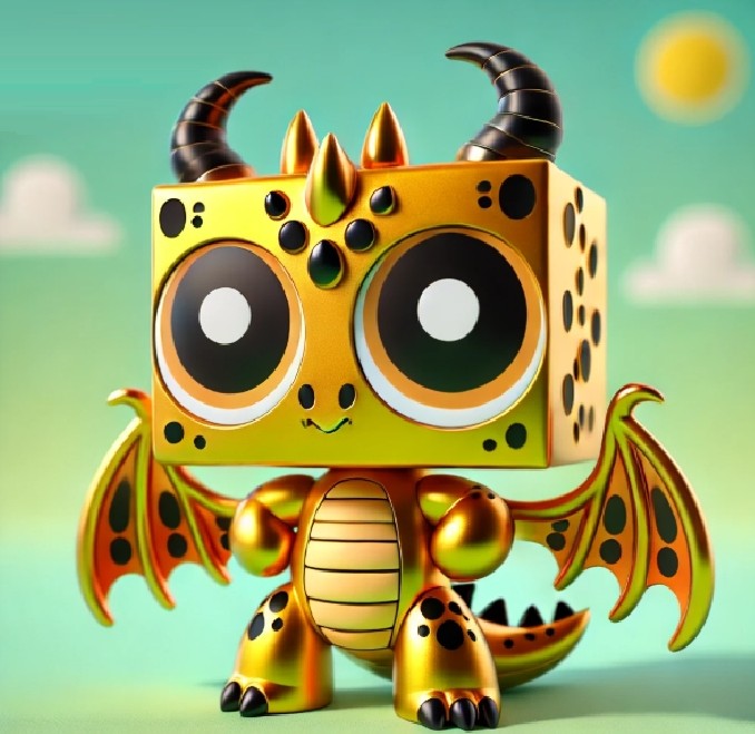 A stylized illustration of a shiny golden dragon toy with a cube-shaped head, large eyes, and tiny wings, in a colorful cartoon style
