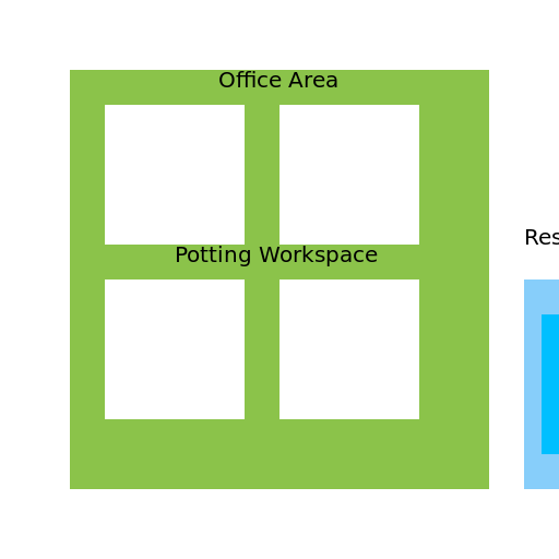 // Includes workspace for potting, an office area, restroom, and plant room w/ irrigation