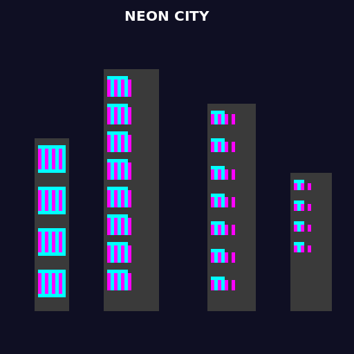 // "Neon City" - A cyberpunk inspired cityscape with glowing neon lights and futuristic architecture.