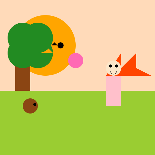 // That butterfly is really fluttering its wings, the bird is chirping, and the squirrel is munching on a nut, but Scarlett is just standing there.