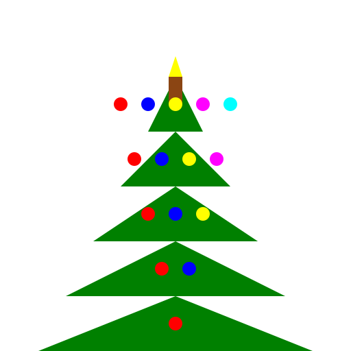 ctx.fillStyle = '#FFFFFF'; ctx.fillRect(0, 0, 512, 512); ctx.fillStyle = '#008000'; var treeHeight = 5; var layerHeight = 80; for (var i = 0; i < treeHeight; i++) { var layerWidth = (treeHeight - i) * 40; var layerY = 512 - (i + 1) * layerHeight; ctx.beginPath(); ctx.moveTo(256, layerY); ctx.lineTo(256 - layerWidth, layerY + layerHeight); ctx.lineTo(256 + layerWidth, layerY + layerHeight); ctx.closePath(); ctx.fill(); } ctx.fillStyle = '#8B4513'; ctx.fillRect(246, 512 - treeHeight * layerHeight, 20, 40); var decorationColors = ['#FF0000', '#0000FF', '#FFFF00', '#FF00FF', '#00FFFF']; for (var i = 0; i < treeHeight; i++) { var layerY = 512 - (i + 1) * layerHeight + layerHeight / 2; for (var j = 0; j <= i; j++) { var decorationX = 256 + (j - i / 2) * 40; ctx.fillStyle = decorationColors[j % decorationColors.length]; ctx.beginPath(); ctx.arc(decorationX, layerY, 10, 0, 2 * Math.PI); ctx.fill(); } } ctx.fillStyle = '#FFFF00'; ctx.beginPath(); ctx.moveTo(256, 512 - treeHeight * layerHeight - 30); ctx.lineTo(246, 512 - treeHeight * layerHeight); ctx.lineTo(266, 512 - treeHeight * layerHeight); ctx.closePath(); ctx.fill();