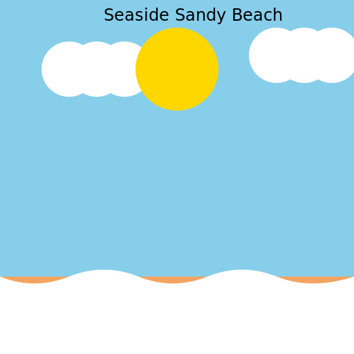 ctx.fillText("Seaside Sandy Beach", 150, 30); // Drawing the title of the drawing