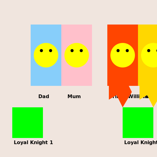 // Creating a royal family portrait with a girly mum, a loving dad, a rude prince, a shy princess, and two loyal knights who adore the princess.