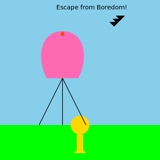 I will draw a person escaping from a boring job by flying on a colorful hot air balloon.