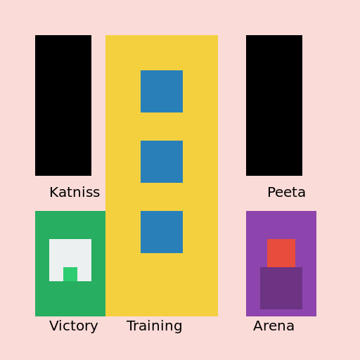 // Drawing a short comic strip depicting the basic elements of a story - rising action and resolution, inspired by Suzanne Collins' Hunger Games