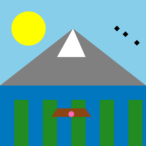 // Let's draw a serene mountain landscape with a calm lake and a clear blue sky!