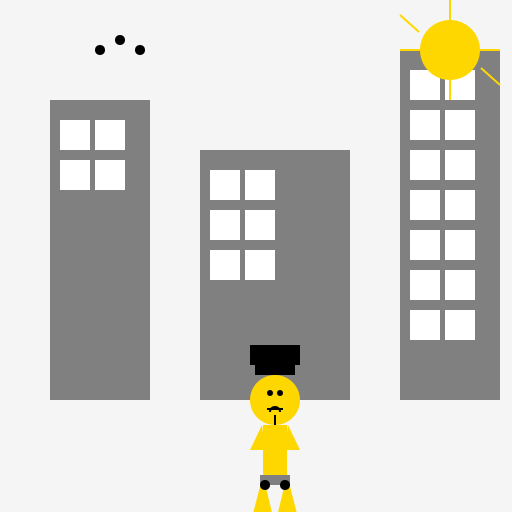 // It's a sunny day in the city, and our migrant friend is exploring the urban landscape, carrying a suitcase and wearing a hat. Birds fly above, while the sun shines brightly.