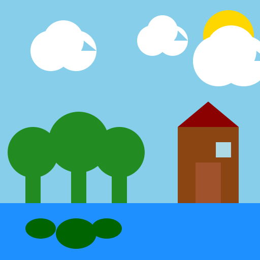 // Scenic Riverside Hut with Sun, Trees, Clouds, and Bushes