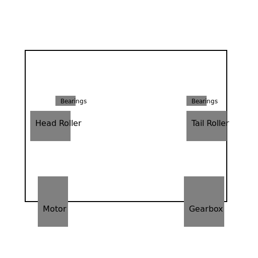 // Featuring Head and Tail Rollers, Frame, Bearings, Motor, and Gearbox
